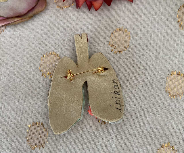 Broche motif poumons anatomique brodée à la main en coton dégradé terracotta, mint et rose fluo.