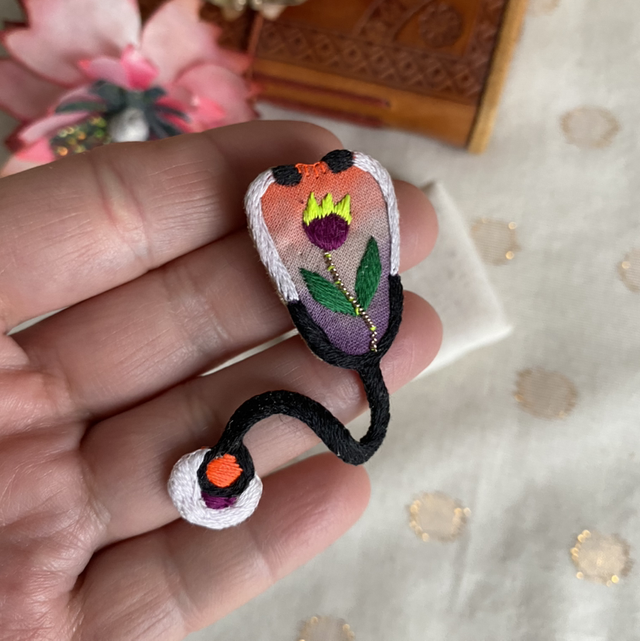 Broche brodée stéthoscope violet orange