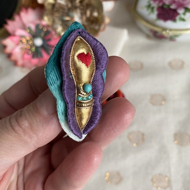 Broche motif vulve anatomique brodée à la main en coton dégradé bleu vert et violet