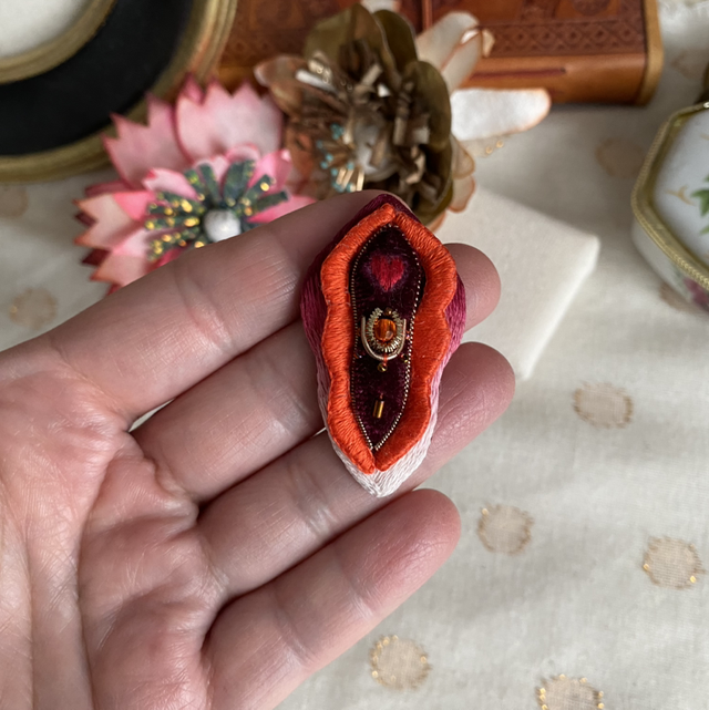 Broche brodée vulve orangé bordeaux