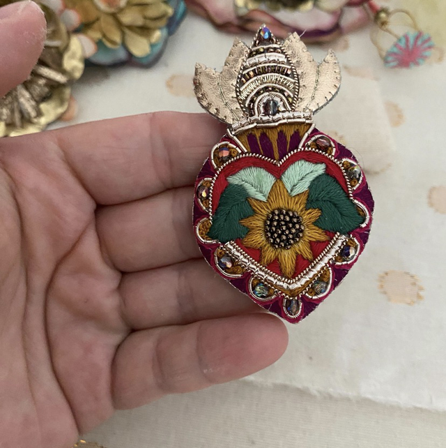 Broche ex voto avec cœur rouge, brodée à la main en coton rouge, pourpre, moutarde, vert et rouge.
