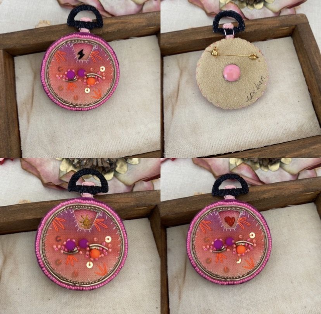 Broche brodée à la main en coton couleur pourpre, orange fluo, rose.
