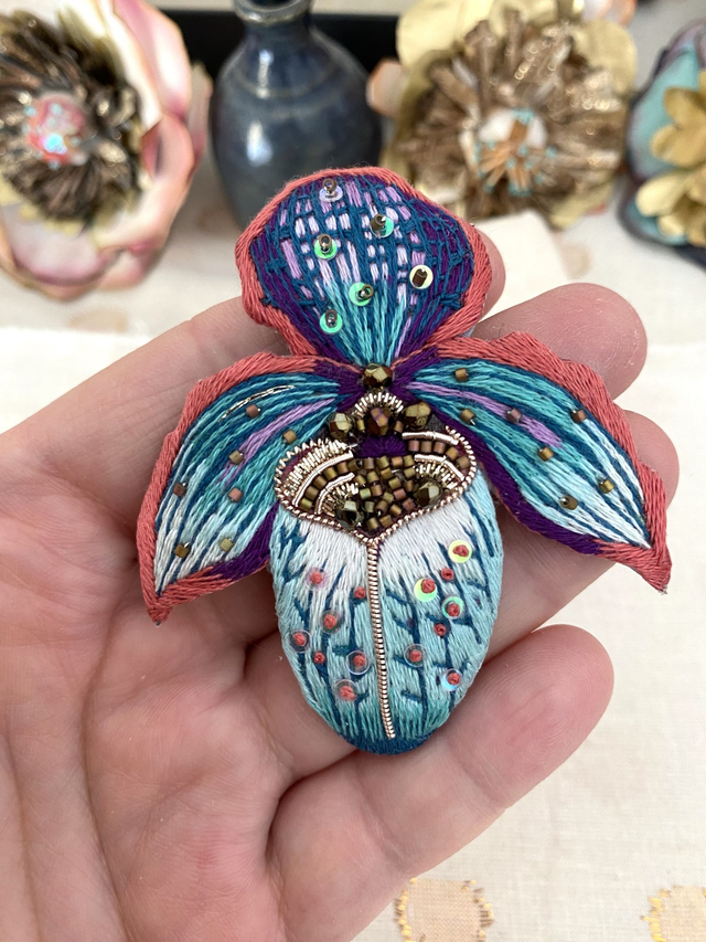Broche motif orchidée brodée à la main en coton dégradé bleu, mauve, corail.