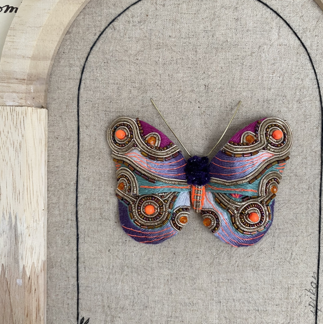 Composition à base de fil métallique et de perles.Papillon brodé violet dégradé, bleu gris, fuchsia et orange fluo.