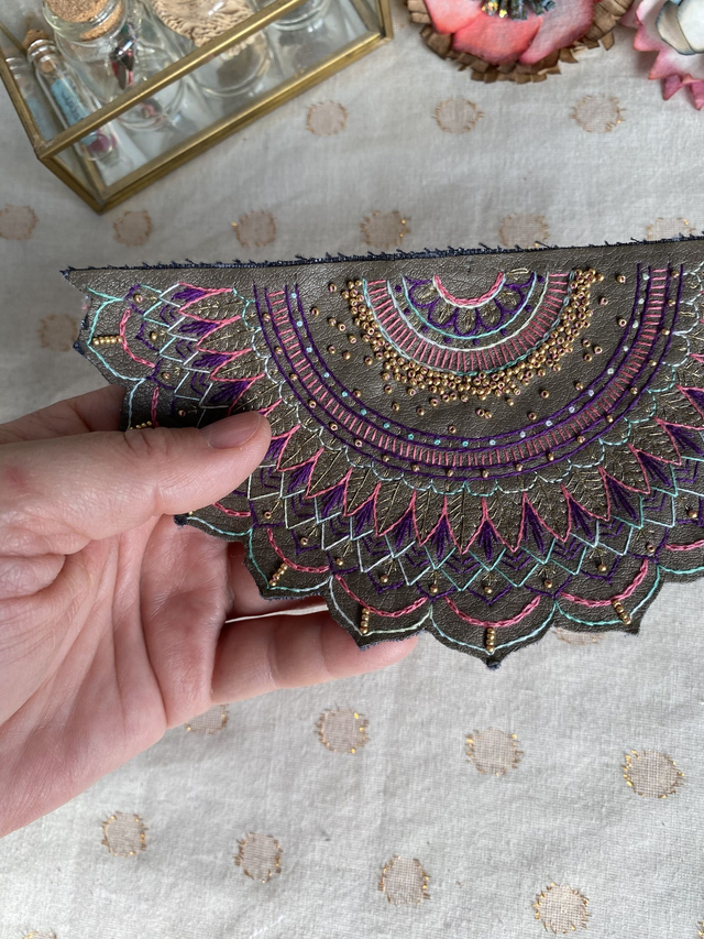Brodé en coton couleur bleu vert nuances, violet, rose bonbon sur similicuir taupe.