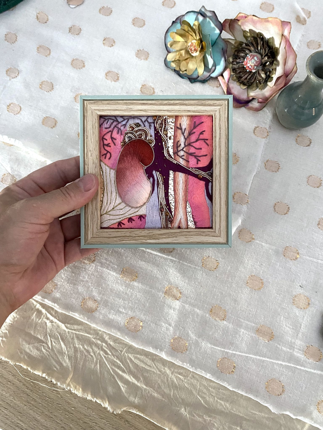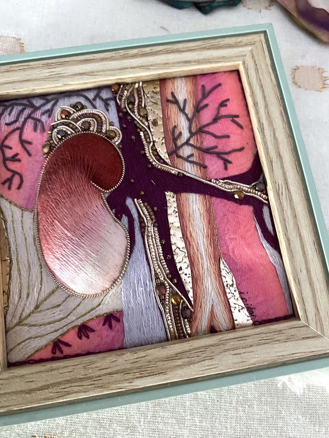 Planche fragment anatomique du rein brodé en coton en dégradé terracotta et vieux rose, pourpre, mauve.