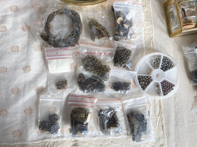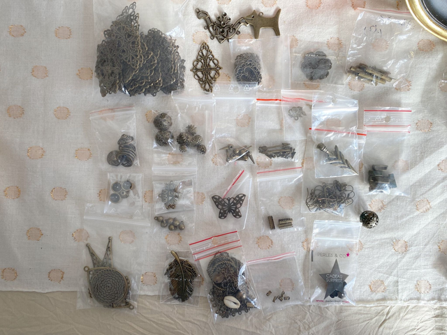 Breloques et estampes diverses minimum 70 pièces / Calottes 26 de 0,8 cm, 16 de 1,5 cm de diamètre / 5 supports bracelets manchettes à serrer / Embouts aveugles de 1,3 cm minimum 30 pièces / Supports boucles d'oreilles minimum 10 pièces / Support collier cordon 4 X 1 cm / Breloque boules et breloque pique / Spike à coudre 1 cm de diamètre minimum 30 pièces / Embouts à griffes 1,5 cm / Embouts cordons de 3 mm 5 pièces / Embouts ressorts cordons 3 mm 6 pièces / Passants pour bracelet plat 1 cm 8 pièces / 5 chaînes différentes avec longueur variables / Perles métal piquetées 3 mm Bronze, cuivré et quelques argentées;