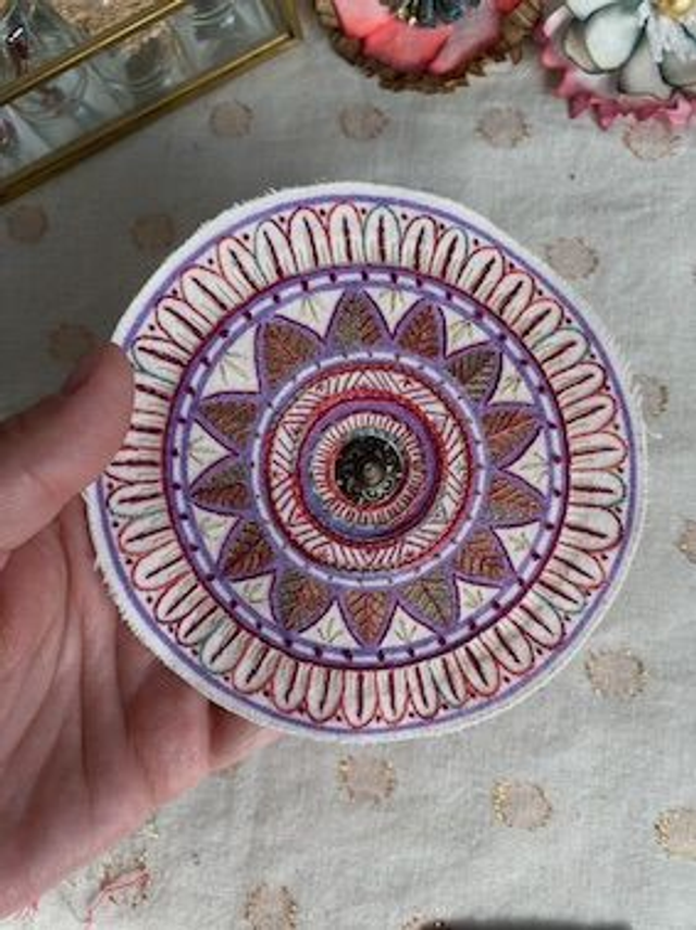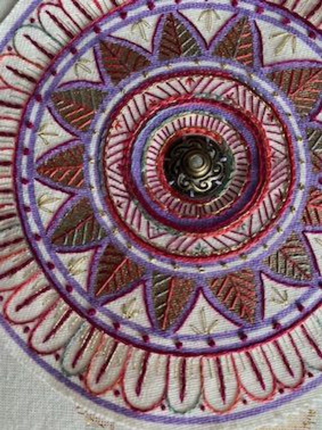 Broderie coton couleur rouge kaki nuances, bordeaux et doré.