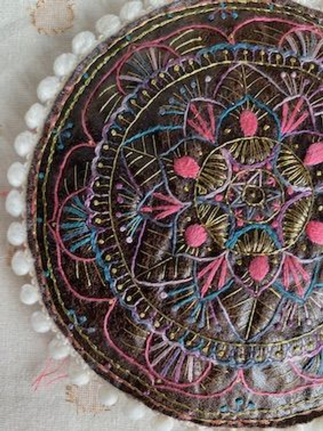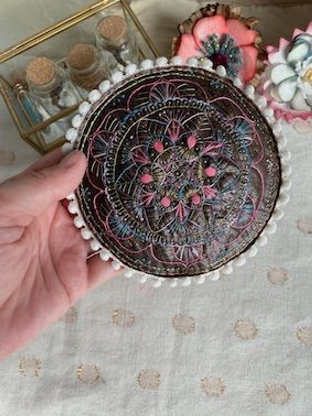 Mandala brodé sur similicuir marron et rembourré.Il est donc en relief.