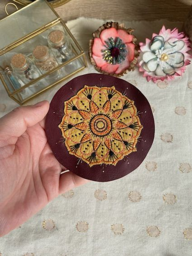 Mandala brodé sur similicuir moutarde puis sur similicuir bordeaux