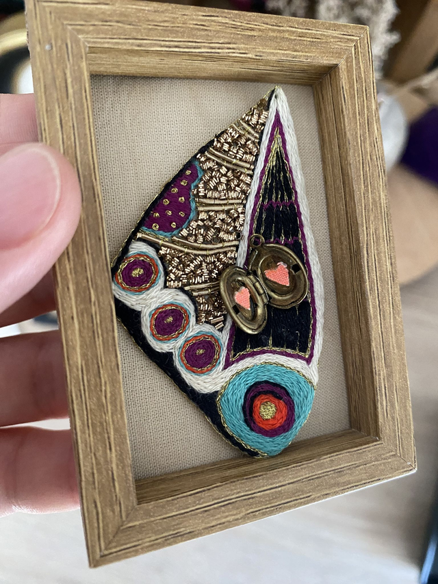 Travail à l’aiguille en coton noir, écru, pourpre, orange, bleu et doré.