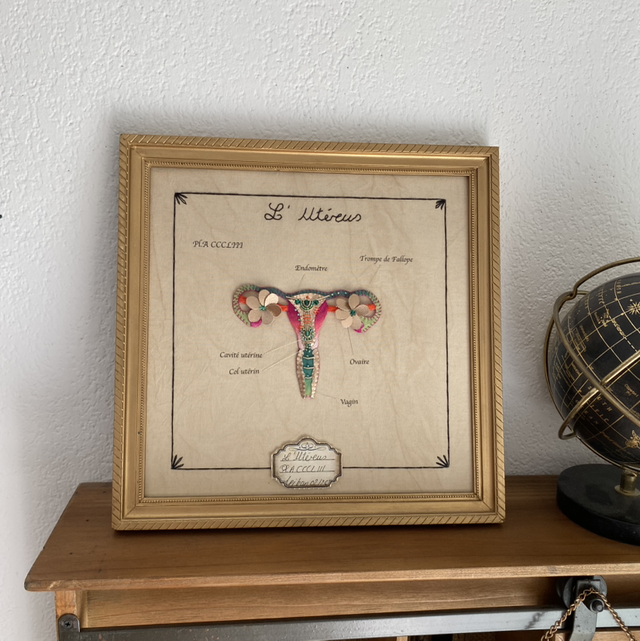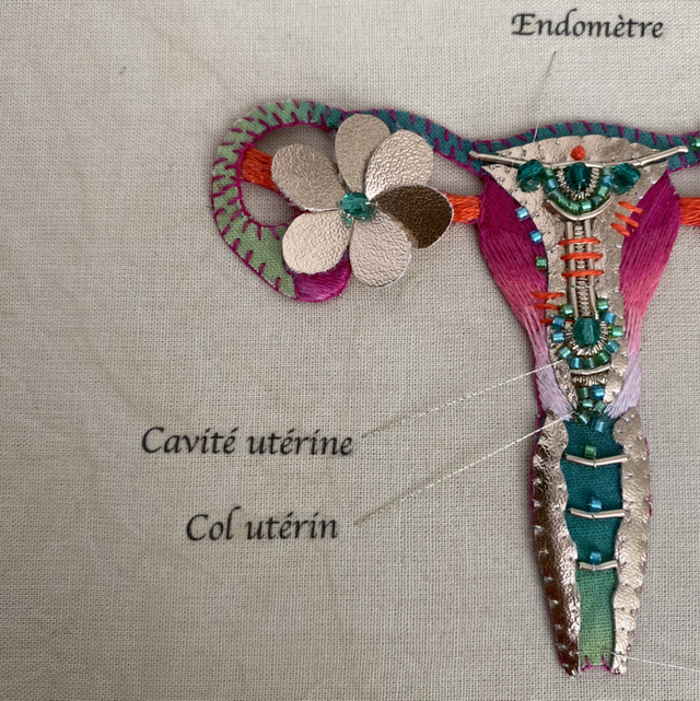 Planche anatomique utérus brodé à la main en coton. Ton dégradé rose, orange.