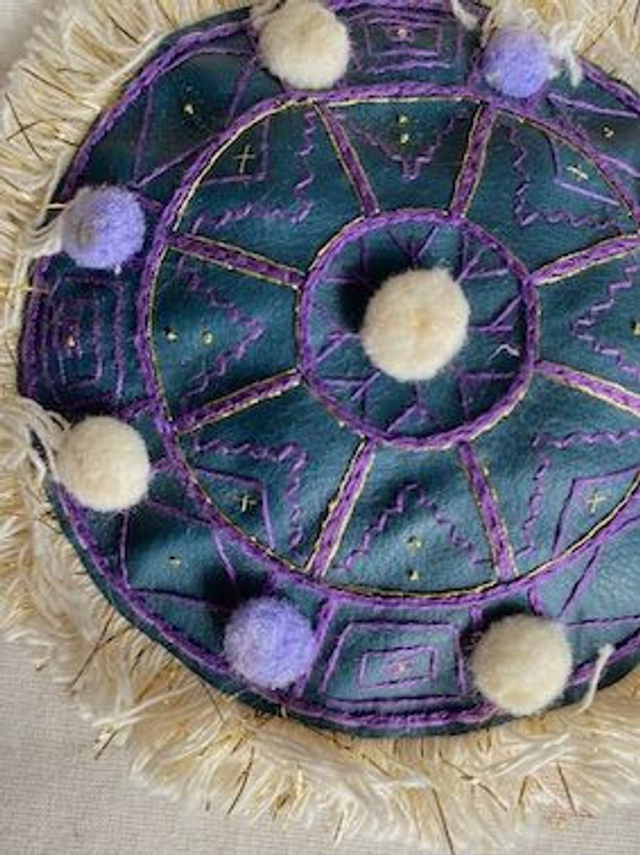 Cercle broder à la main sur simili cuir bleu pétrole en coton violet et fil doré.