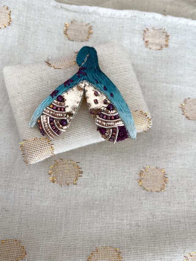 Broche motif anatomique clito brodée à la main en coton dégradé bleu, violet.