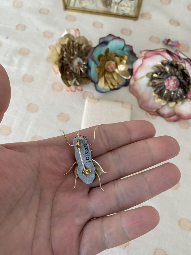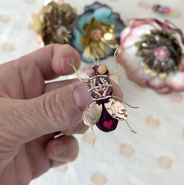 Broche insecte mouche aubergine fuchsia brodée à la main