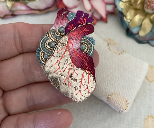 Broche motif coeur anatomique brodée à la main en coton de dégradé bordeaux, bleu gris, rose fluo.