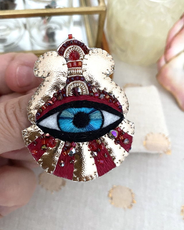 Broche rouge oeil bleu